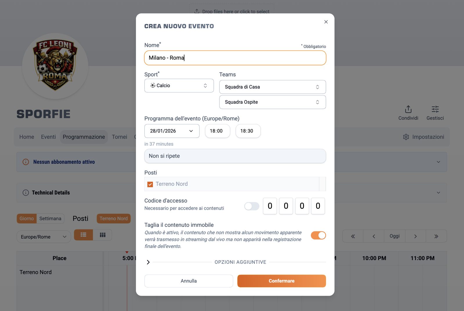 Aggiungi nuovi eventi al calendario con un'interfaccia semplice e veloce. Specifica data, ora, luogo e dettagli, e l'evento sarà subito visibile a tutti i membri e follower della squadra.