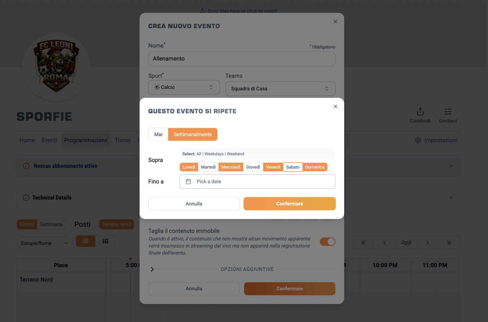 Per allenamenti settimanali o serie di partite, crea eventi ricorrenti che si ripetono automaticamente. Usa i template per risparmiare tempo nella programmazione della stagione.